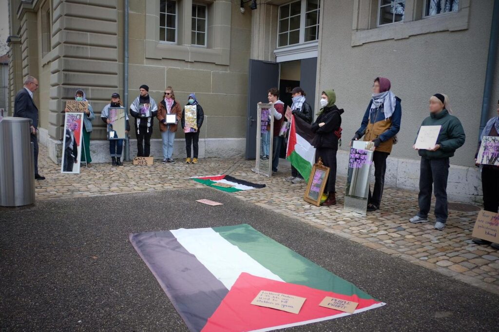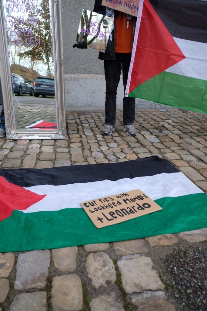 Die Schweizer Rüstungsindustrie kollaboriert mit verschiedenen Rüstungsfirmen, welche direkt vom Genozid in Gaza profitieren. Am 6. November hielten wir Ihnen am Lobby-Treffen der Schweizerischen Gesellschaft Technik und Armee einen Spiegel vor.